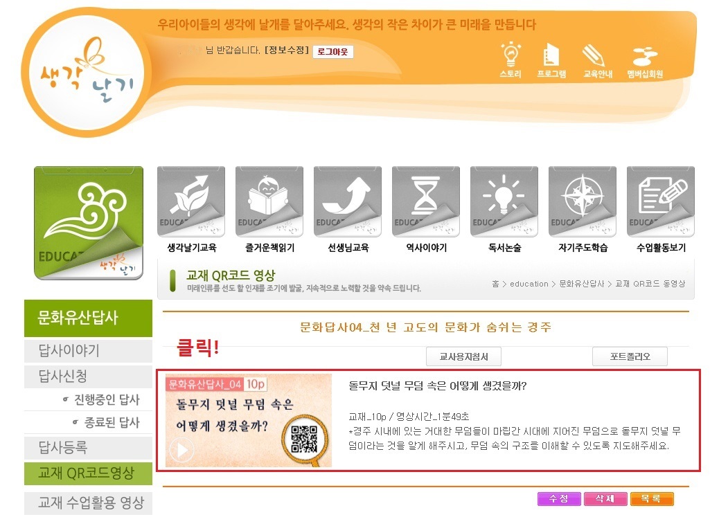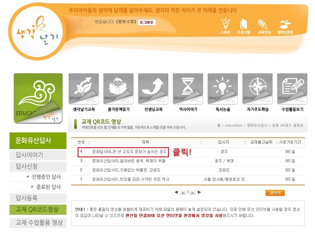 °ú¸ñÀ» Ŭ¸¯Çؼ µé¾î±â¸é QRÄÚµå ¸ñ·ÏÀÌ ¶ßÁÒ? °Å±â¼ ½ÃûÇÒ ¿µ»óÀ» ¼±ÅÃÇØ¼ Ŭ¸¯ÇØÁÖ¼¼¿ä.
