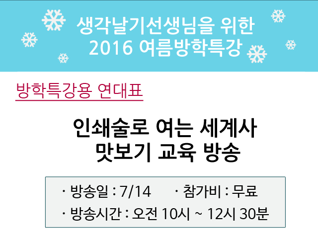 ¼³Ä¡°¡ ³¡³ª¼Ì´Ù¸é 7/14ÀÏ 10½Ã ¹æ¼Û±¹¿¡ ¿À¼Å¼ ½ÃûÇϱ⸦ Ŭ¸¯ÇÏ½Ã¸é ¡Ù »ý°¢³¯±â ¼±»ý´ÔÀ» À§ÇÑ 2016³â ¿©¸§¹æÇРƯ°À» ¹«·á·Î ½Ãû °¡´ÉÇÕ´Ï´Ù. °¨»çÇÕ´Ï´Ù.