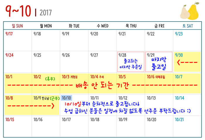 ¾È³çÇϼ¼¿ä. »ý°¢³¯±âÀÔ´Ï´Ù. 2017³â Ãß¼® ¿¬ÈÞ ÀÏÁ¤À» ¾È³»Çص帮°íÀÚ °øÁöÇÕ´Ï´Ù.(¾Æ·¡ »çÁø ÂüÁ¶) ÈÞÀÏÀº 10¿ù 2ÀÏ(¿ù)ºÎÅÍ 6ÀÏ(±Ý)±îÁöÀÔ´Ï´Ù. 9ÀÏ Çѱ۳¯ °øÈÞÀÏÀ» 2ÀÏ·Î ¿Å°Ü 2ÀÏÀº ÈÞ¹«, 9ÀÏÀº ±Ù¹«¸¦ ÇÕ´Ï´Ù. (9Àϳ¯ º»»ç´Â ±Ù¹«¸¦ ÇÏÁö¸¸, Åùè»ç´Â ÈÞ¹«ÀÔ´Ï´Ù.) µû¶ó¼, ¿¬ÈÞÀü Ãâ°í °¡´ÉÇÑ ¸¶Áö¸· ÁÖ¹®ÀÏÀº 9¿ù 28ÀÏÀ̸ç, ¸¶Áö¸· Ãâ°íÀÏÀº 9¿ù 29ÀÏÀÔ´Ï´Ù. Áï, 9¿ù 28ÀϱîÁö ÀÔ±ÝÀÌ ¿Ï·áµÈ ÁÖ¹®°Ç¿¡ ÇÑÇØ 9¿ù 29ÀÏ¿¡ Ãâ°í°¡ µÇ¸ç, 9¿ù 30ÀϺÎÅÍ 10¿ù 9ÀϱîÁö ÃÑ '¿Èê°£' ¹è¼ÛÀÌ µÇÁö ¾Ê½À´Ï´Ù. 9¿ù 29ÀϺÎÅÍ Á¢¼öµÈ ÁÖ¹®°Ç¿¡ ´ëÇØ¼´Â 10¿ù 10ÀϺÎÅÍ ¼øÂ÷ÀûÀ¸·Î ¹è¼ÛÀÌ µÉ ¿¹Á¤ÀÌÁö¸¸, ±ä ¿¬ÈÞ·Î ÀÎÇØ Åùè»ç Ãø¿¡¼µµ ¹°Ç° ¹è¼ÛÀÌ Áö¿¬µÇ´Â ¹®Á¦°¡ ¹ß»ýÇÒ ¼ö ÀÖÀ¸¹Ç·Î ¼±»ý´Ôµé²²¼´Â ¼ö¾÷ ÀÏÁ¤¿¡ Â÷ÁúÀÌ ¾øµµ·Ï °¡±ÞÀû ¹Ì¸® ÁÖ¹®ÇØ ÁÖ½Ã±æ ¹Ù¶ø´Ï´Ù.^^ ¿ì¸® »ý°¢³¯±â ¼±»ý´Ôµéµµ µû¶æÇϰí dz¼ºÇÑ ÈÞ°¡ º¸³»½Ã±æ ¹Ù¶ø´Ï´Ù~¢½ °¨»çÇÕ´Ï´Ù.