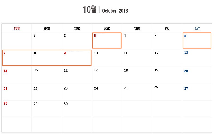 10¿ù03ÀÏÀº °³ÃµÀý·Î ¹è¼ÛÀÌ ¾ø´Â ³¯À̸ç 10¿ù09ÀÏÀº Çѱ۳¯·Î ¹è¼ÛÀÌ ¾ø½À´Ï´Ù.